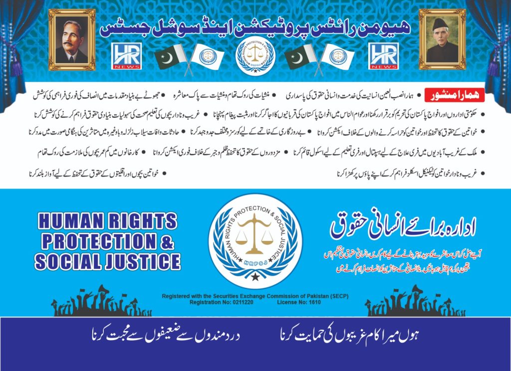 “The Human Rights Protection & Social Justice (HRPSJ) is a non-governmental, non-profit organization dedicated to promoting, protecting, and defending human rights and social justice in Pakistan. It is registered with the Securities and Exchange Commission of Pakistan (SECP) under Section 42 of the Companies Ordinance, 1984.”