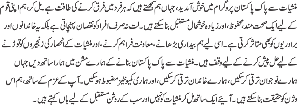 Welcome to the Drug-Free Pakistan Program, where we believe that every individual has the power to make a difference. Together, we can build a healthier, safer, and more prosperous future for our nation. Addiction not only harms individuals, but it also affects families and communities. That’s why we are dedicated to raising awareness, providing support, and offering solutions to break the chains of drug dependency. Join us in our mission to create a drug-free Pakistan – one where our youth can thrive, our families can flourish, and our communities can grow strong. With your commitment, we can make this vision a reality. Together, let’s say no to drugs and yes to a brighter future for all.