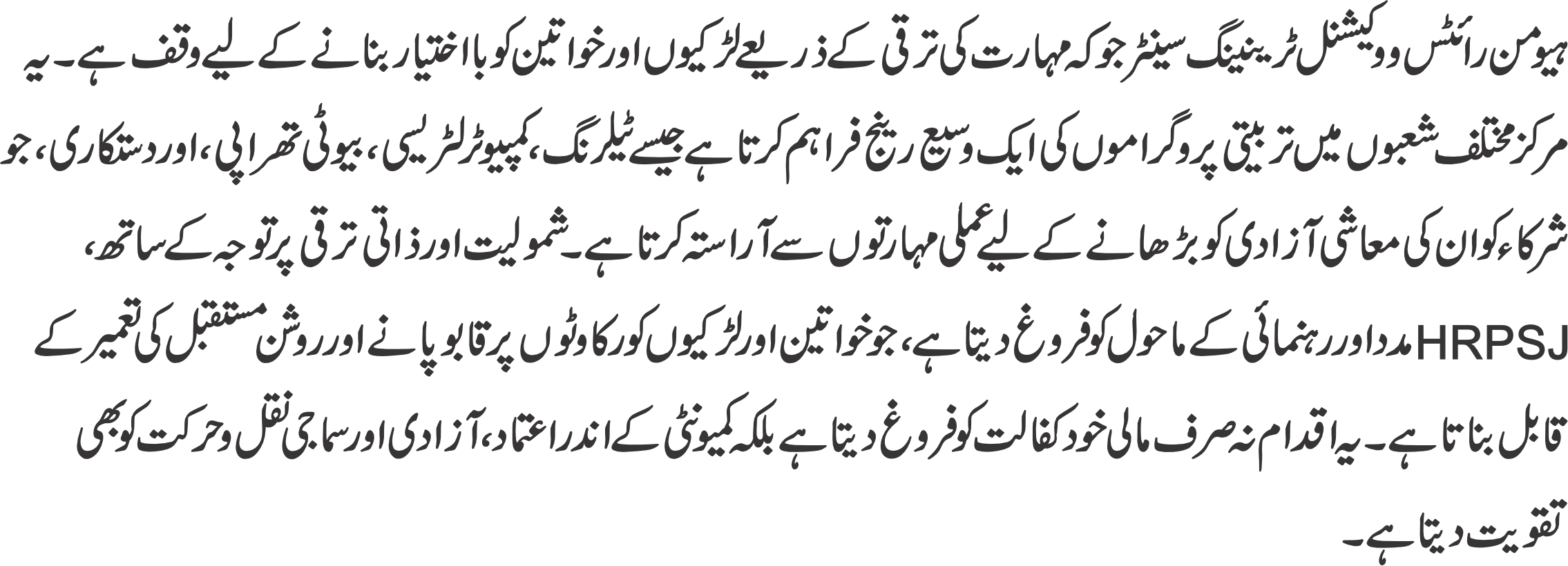 .HRPSJ (Human Rights Protection Society for Justice) runs a transformative vocational training center dedicated to empowering girls and women through skill development. The center provides a wide range of training programs in various fields such as tailoring, computer literacy, beauty therapy, and handicrafts, equipping participants with practical skills to enhance their economic independence. With a focus on inclusivity and personal growth, HRPSJ fosters an environment of support and mentorship, enabling women and girls to overcome barriers and build brighter futures. This initiative not only promotes financial self-sufficiency but also strengthens confidence, independence, and social mobility within the community.